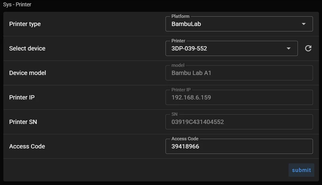 - 访问码为打印机的局域网模式访问码,可以按照步骤1在打印机的设置中查看