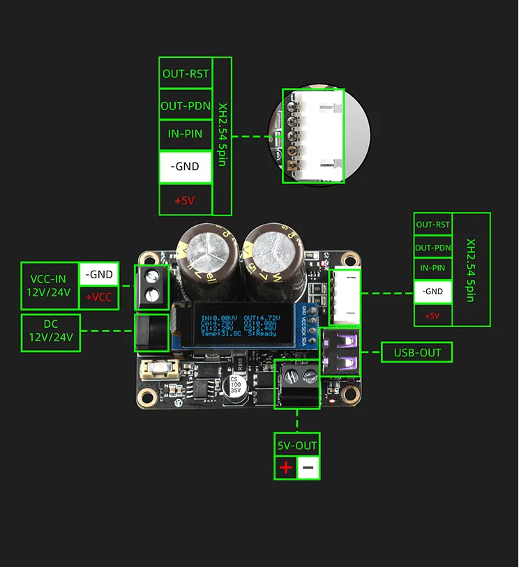 搭配安全关机模块时候,需要使用 12V-24V 电源供电,为确保模块工作正常,安全关机模块板内 5V 输出电压不能低于 4.9V,否则 安全关机模块 会从内部升压取电,电容会一直处于充电状态,导致模块持续发热