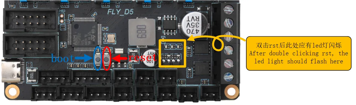 - 使用TypeC数据线将主板连接至上位机后,双击rerset按钮,此时主板上会有LED灯闪烁。