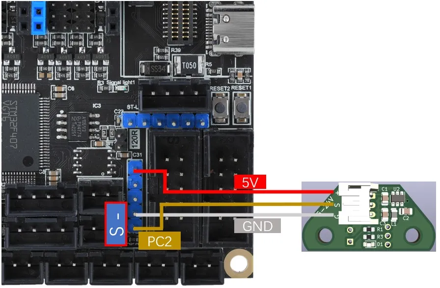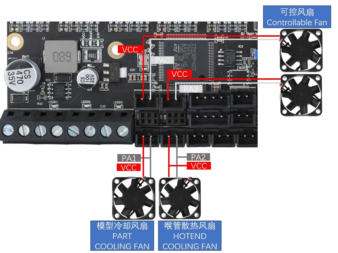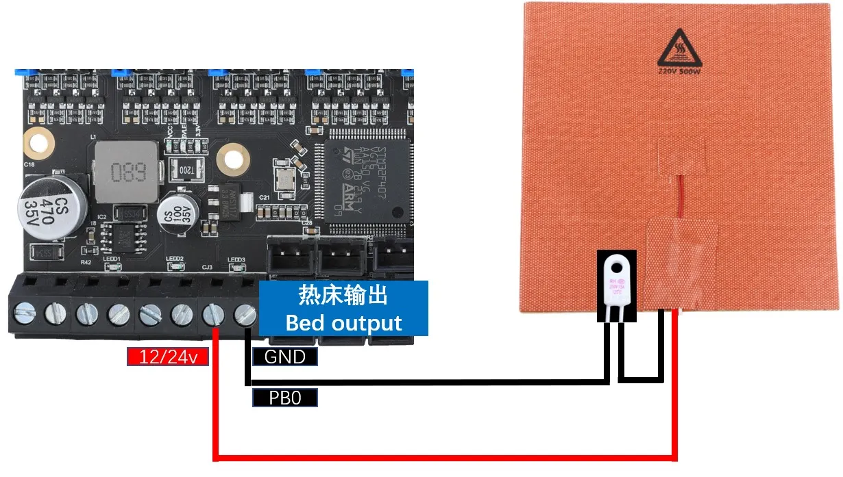 直流热床: 板载MOS接直流热床时请注意使用功率,直流热床最大电流不能超过10A。如果超过10A,建议使用外接MOS模块来使用热床,否则可能会对主板造成不可逆的损伤。