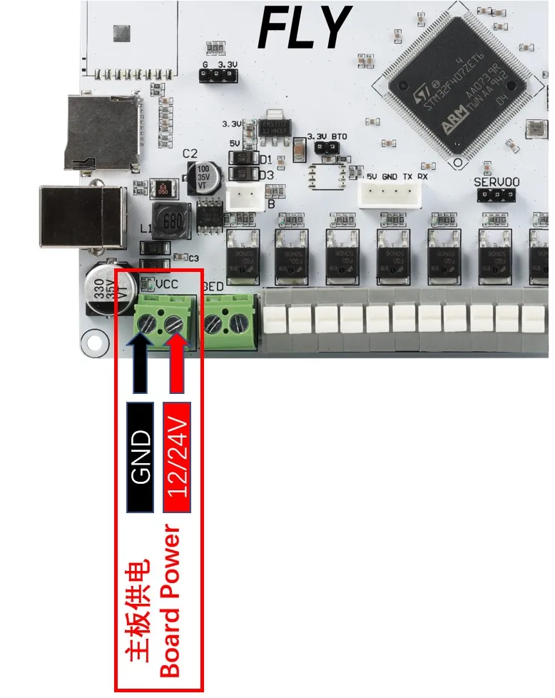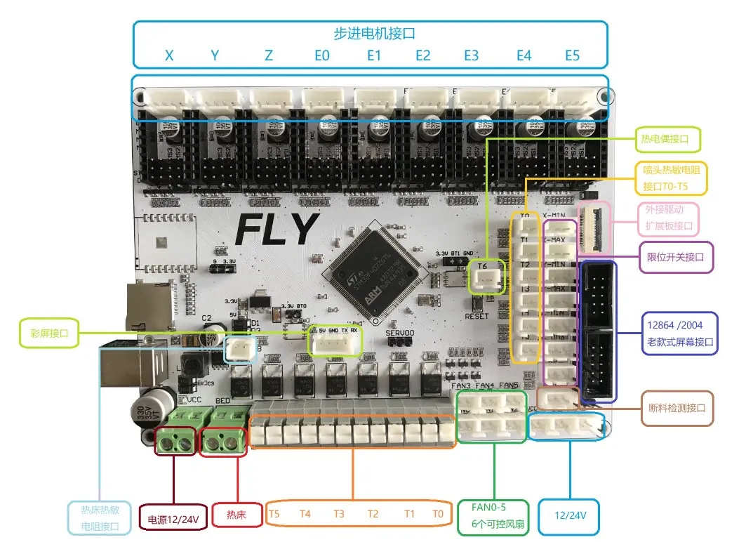 直流热床: 板载MOS接直流热床时请注意使用功率,直流热床最大电流不能超过10A。如果超过10A,建议使用外接MOS模块来使用热床,否则可能会对主板造成不可逆的损伤。