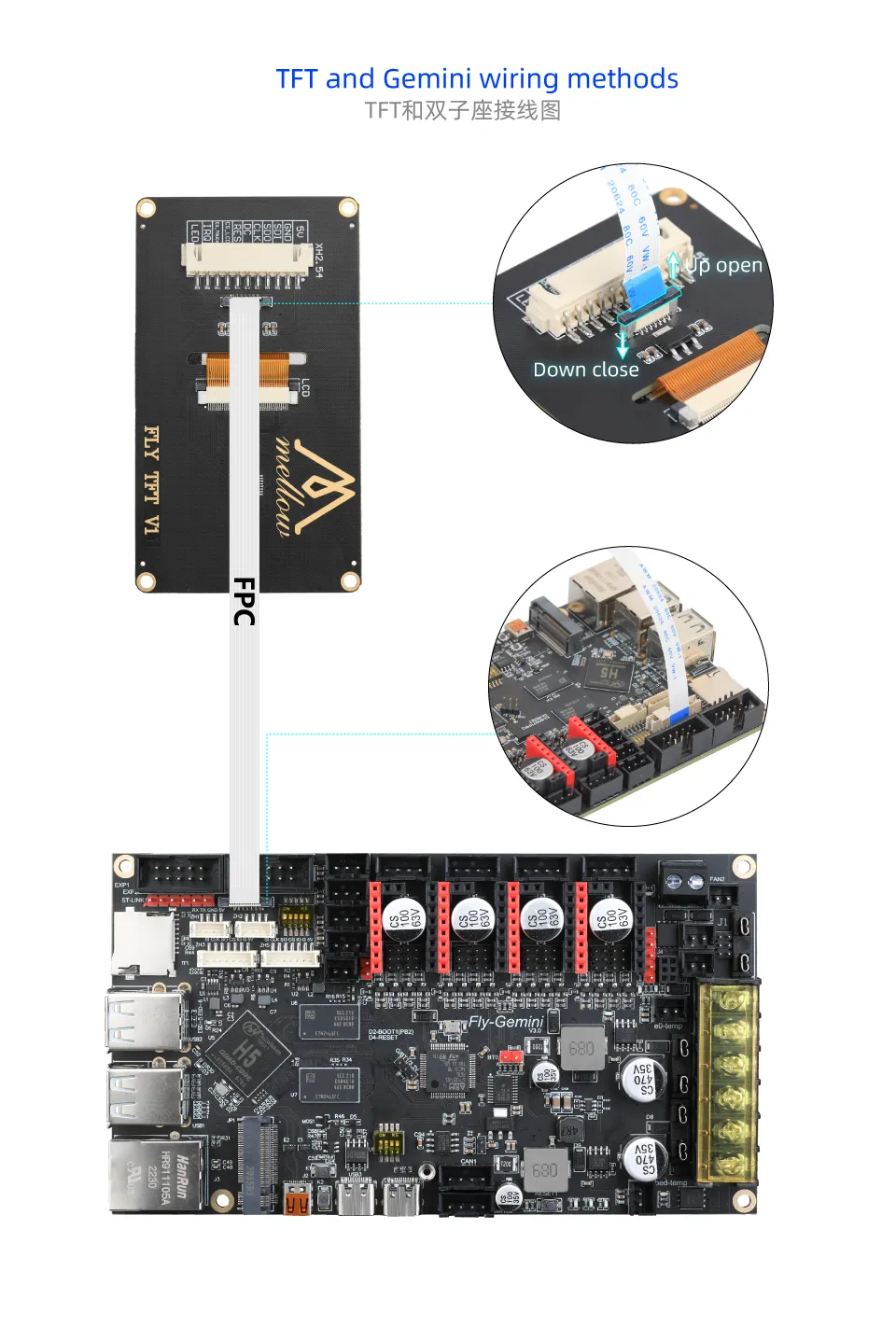 主板类FLY-Gemini 系列主板FLY-Gemini v3屏幕接线与配置屏幕接线与配置 信息 FLY-TOOLS需要上位机联网后输入上位机的IP+:9999访问 比如192.168.6.110:9999 TFT接线HDMI接线 需要在FLY TOOLS中按下方配置屏幕并且打开KS FLY-Pi TFT屏接线 需要在FLY TOOLS中按下方配置屏幕并且打开KS 需要使用FPC转HDMI小板 请注意需要接上带有数据传输功能type-c到模块上