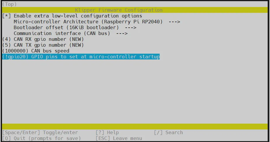 • 其中 rm -rf ~/klipper/.config && rm -rf ~/klipper/out是删除之前编译数据与固件make menuconfig是编译固件,执行后应该出现下方界面