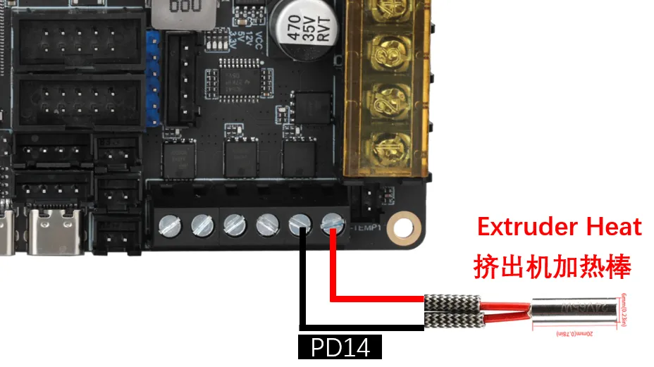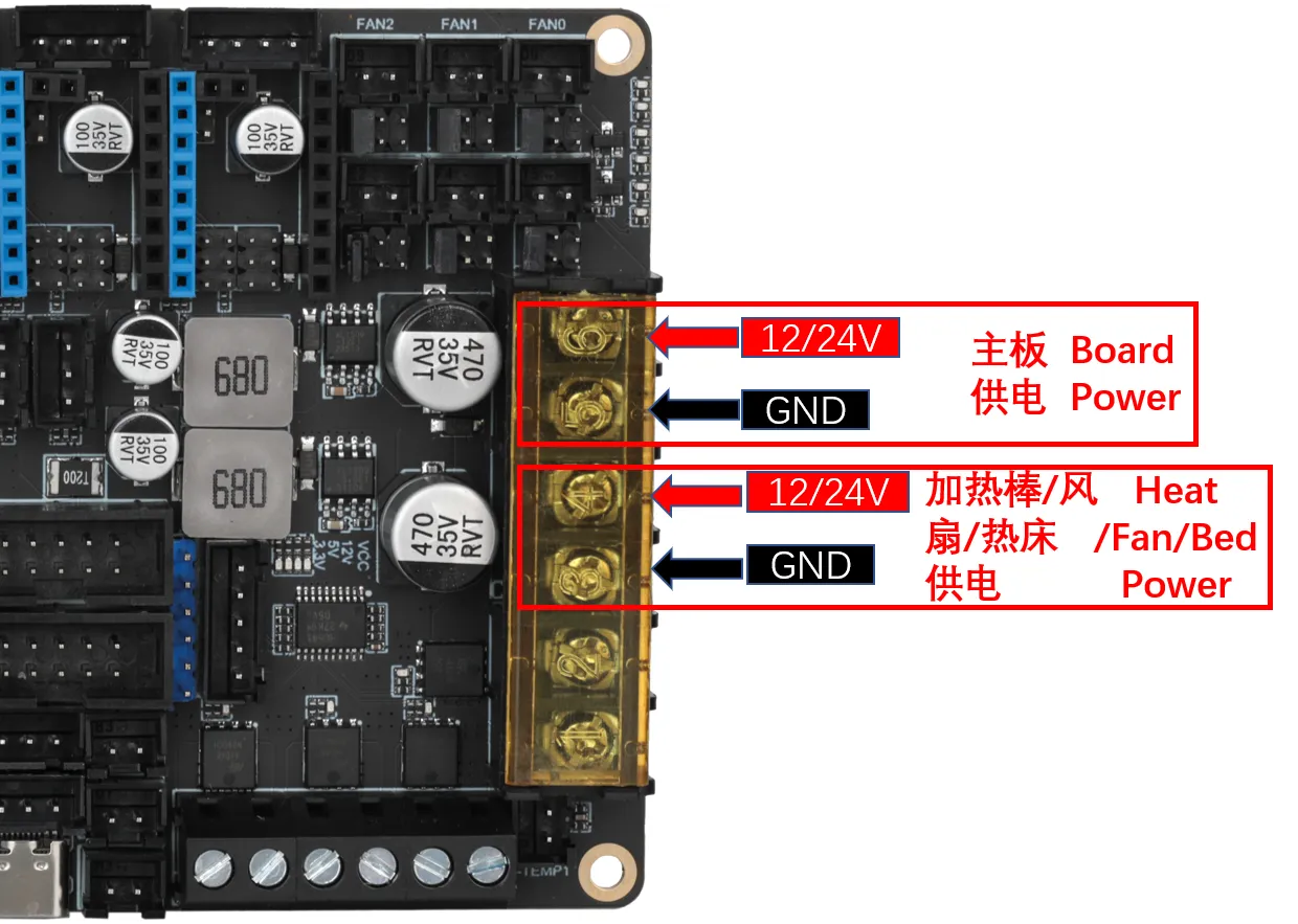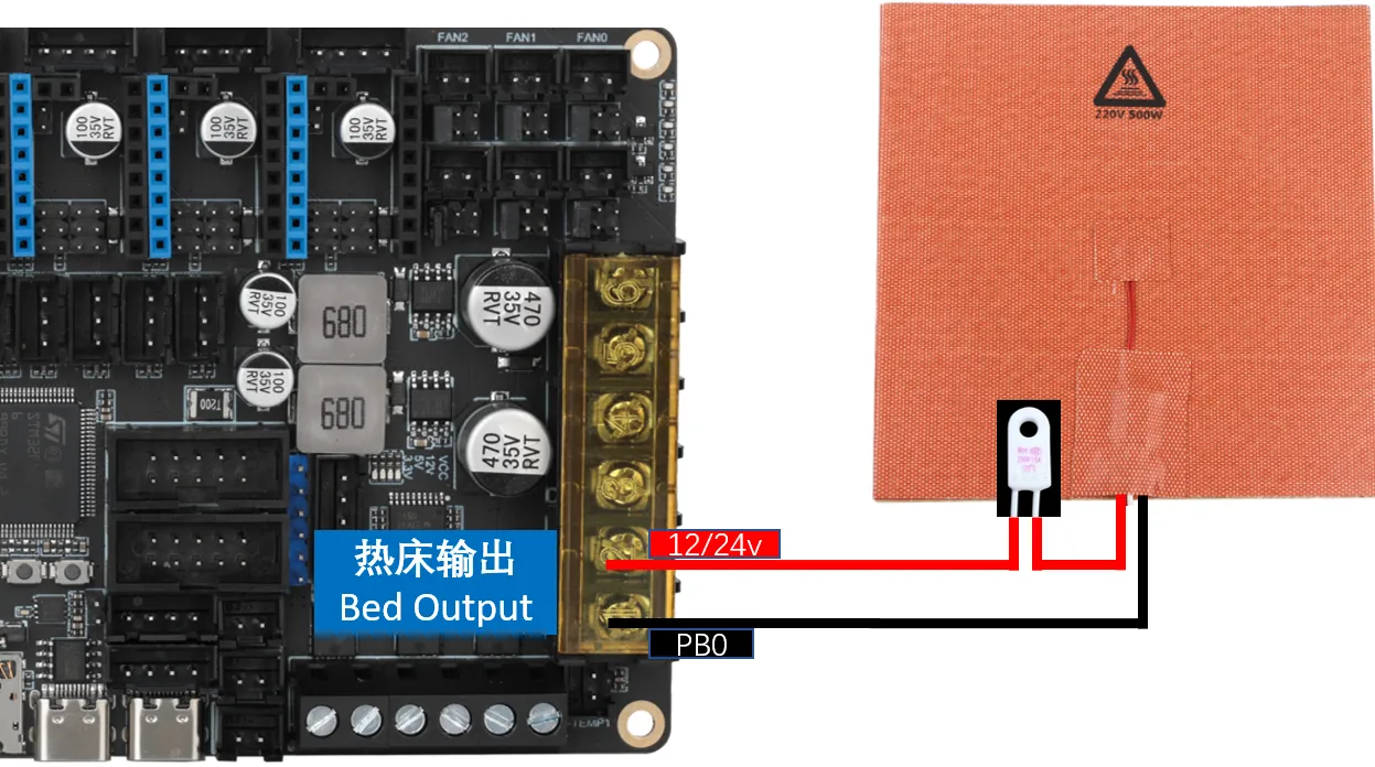 • DC Bed: When connecting the onboard MOS to a DC bed, pay attention to the power usage. The maximum current for a DC bed cannot exceed 10A. If the current exceeds 10A, it is recommended to use an external MOS module to use the bed, otherwise, it may cause irreversible damage to the motherboard.