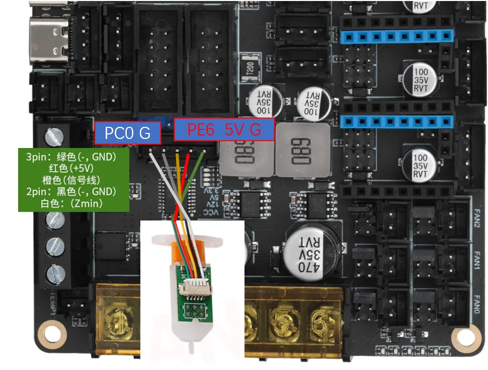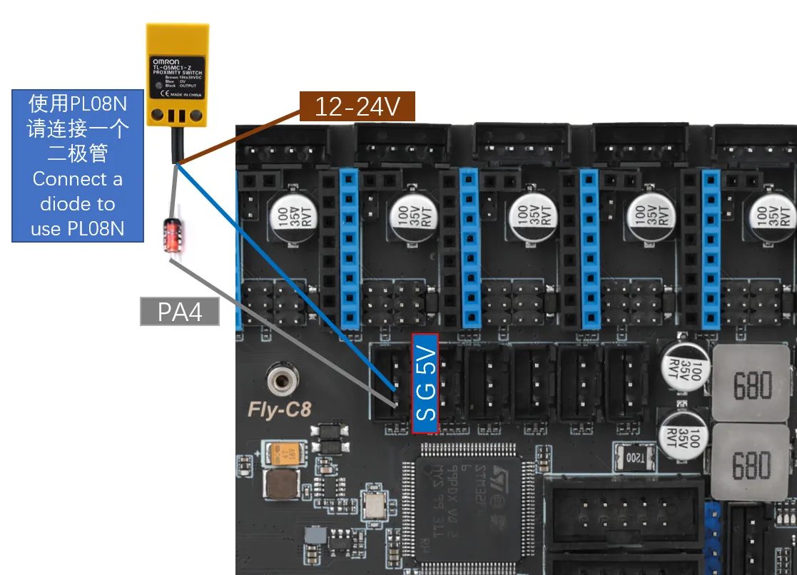 • VORON officially recommends using the Omron TL-Q5MC sensor (previously, PL08N was recommended, but the principles are the same, only the detection distance differs) for bed leveling. The wiring method is as shown below.