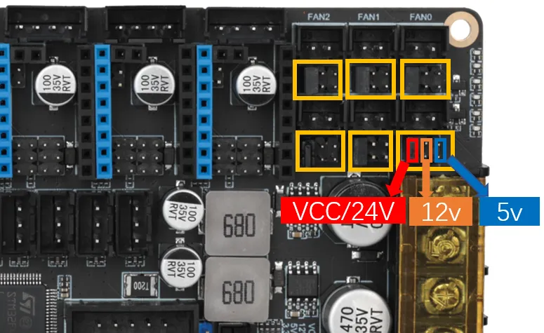 Choose the fan voltage. By shorting the corresponding voltage pins with a jumper cap, choose as shown in the following diagram. Note: The jumpers within the yellow boxes in the diagram are the same. Incorrectly choosing the fan voltage may damage the fan or MOS module.