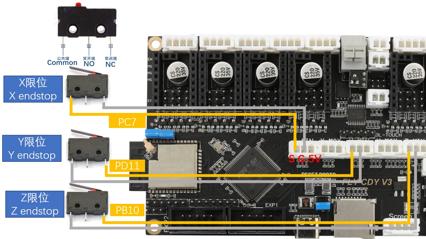 Limit switches have two types: Normally Open (NO) and Normally Closed (NC). Generally, in 3D printers, it is recommended to use Normally Closed (NC). This way, if there is a problem with the limit switch circuit, the system will report an error in time, preventing unnecessary crashes and protecting the printer from damage.