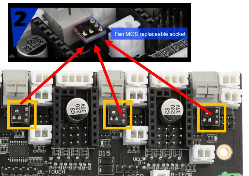 DC Bed: When connecting the DC bed to the onboard MOS, pay attention to the power usage. The maximum current for a DC bed cannot exceed 10A. If it exceeds 10A, it is recommended to use an external MOS module for the bed to avoid irreversible damage to the motherboard.