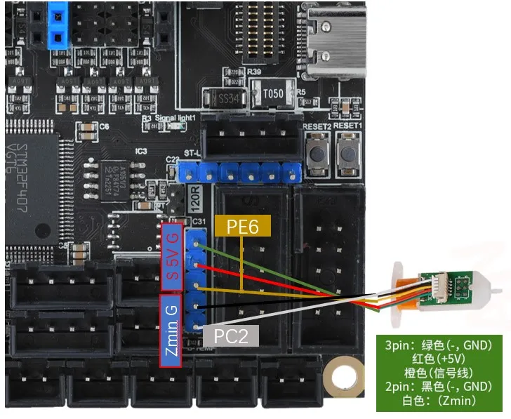 BL-touch has five wires in total. The first group consists of three wires responsible for powering the sensor and retracting the probe. The second group consists of ground and signal wires, outputting limit signals. Please carefully check the wire sequence when wiring the BL-touch, incorrect wiring may permanently damage the sensor and motherboard!!! Wiring method is shown below.