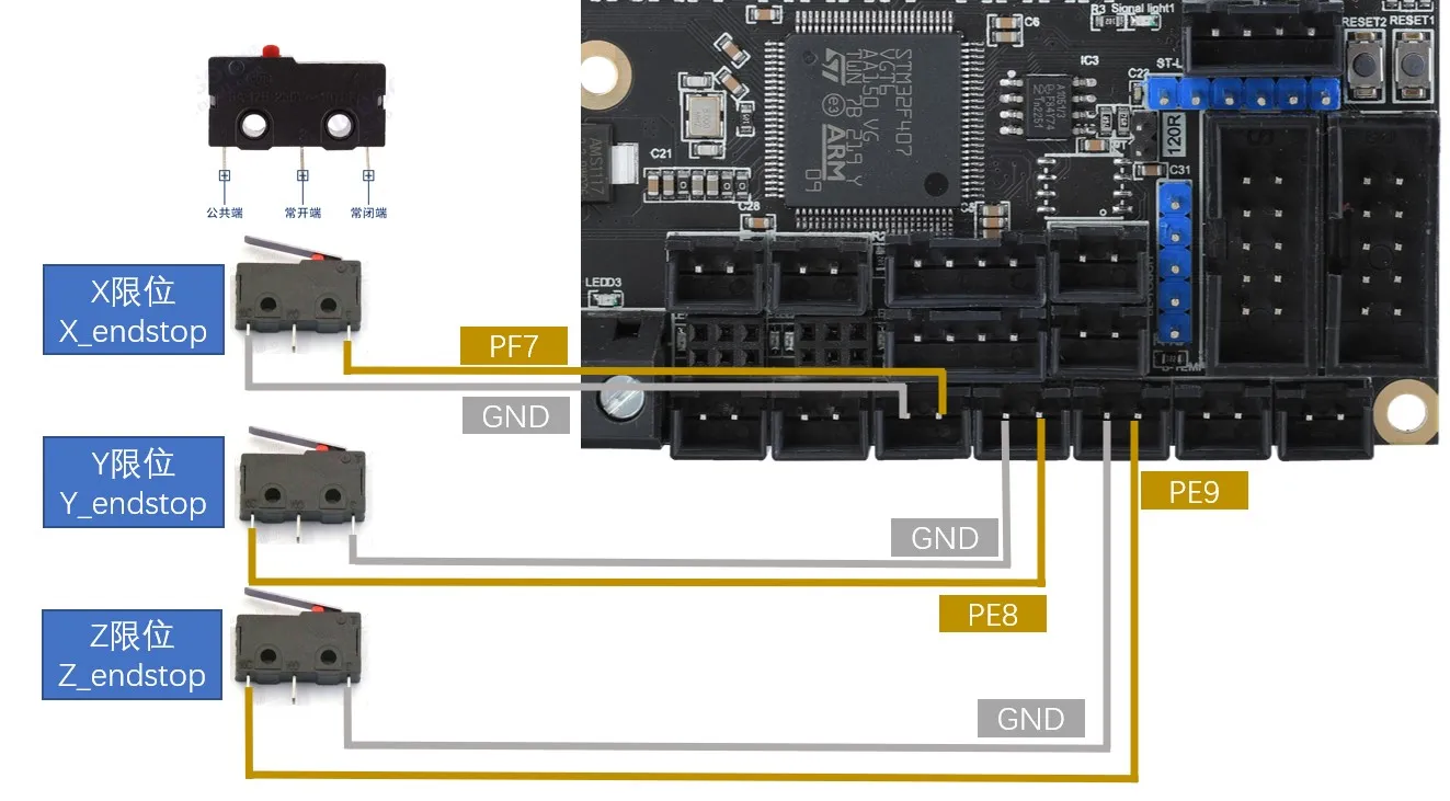 Limit switches come in normally open (NO) and normally closed (NC) types. Generally, in a 3D printer, it is recommended to use normally closed (NC). This way, if there is an issue with the limit switch circuit, the system will promptly report an error, avoiding unnecessary crashes and damage to the printer.