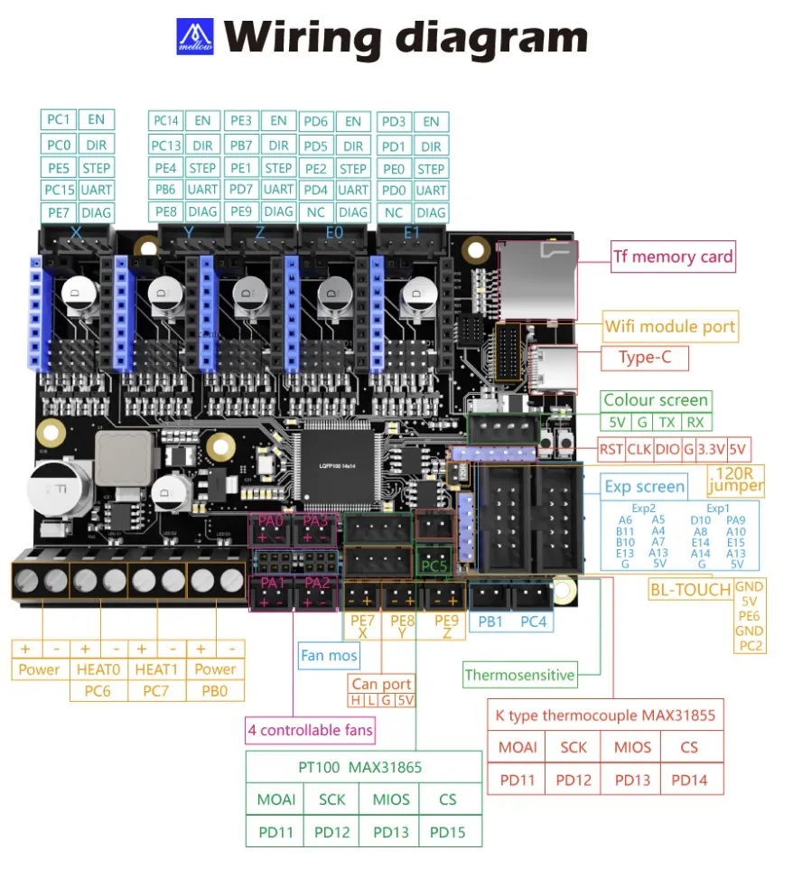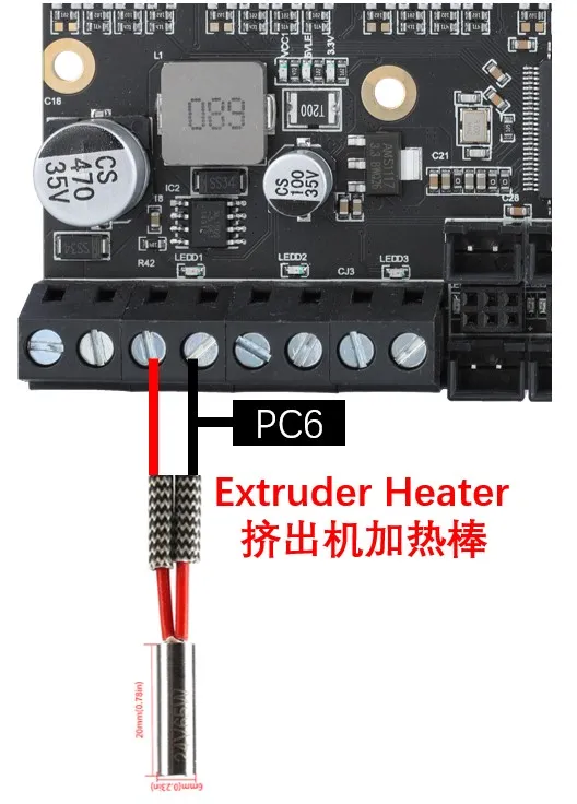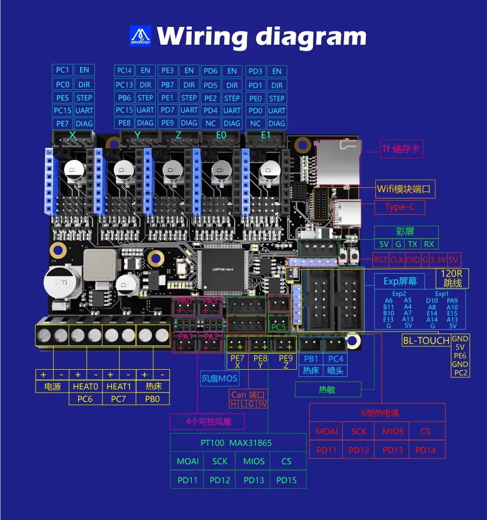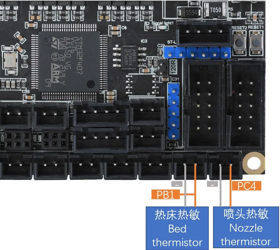 DC Bed: When connecting the onboard MOS to the DC bed, please pay attention to the power usage. The maximum current for the DC bed cannot exceed 10A. If it exceeds 10A, it is recommended to use an external MOS module to power the bed, otherwise, it may cause irreversible damage to the motherboard.