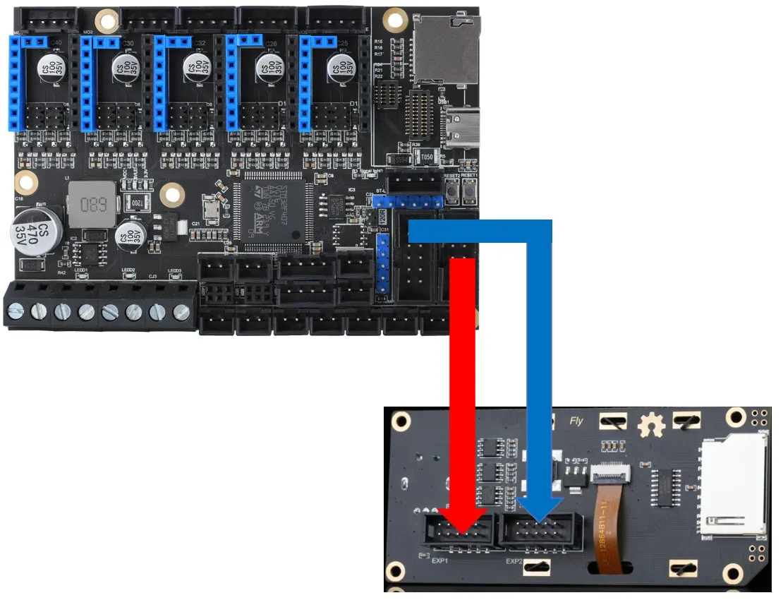 The diagram below shows the wiring method for the FLY mini12864. Please consult the respective manufacturer for screens from other manufacturers. If the Mini12864 screen is wired incorrectly, it may cause the host computer to fail to connect to the MCU. If you can normally connect the motherboard's MCU with the mini12864 screen before using it, and after using the mini12864 screen, you can no longer connect to the MCU, try unplugging the mini12864 wiring!!!