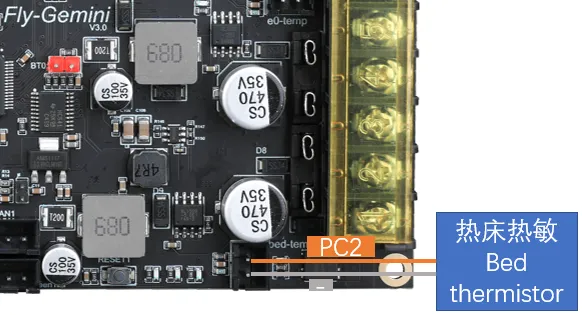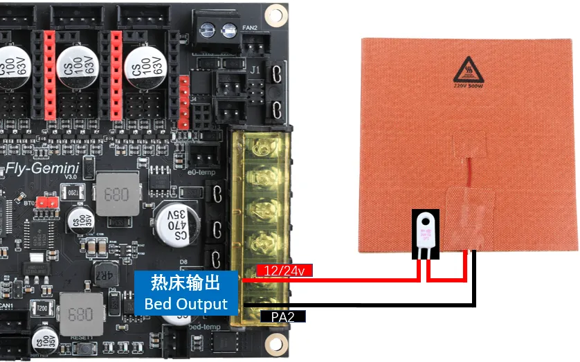 DC Bed: When connecting a DC bed to the onboard MOSFET, pay attention to the power usage. The maximum current for a DC bed cannot exceed 10A. If it exceeds 10A, it is recommended to use an external MOS module to connect the bed to avoid irreversible damage to the main board.