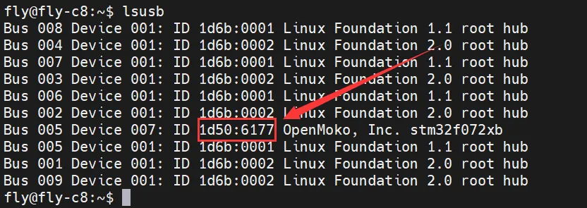 1d50:6177belongs to the device you will be using. Ignore the subsequent prompts as system issues might cause them to display incompletely or not at all.- If not, check if the data cable is properly connected or if the motherboard is in Katapult mode (formerly known as CANBOOT).