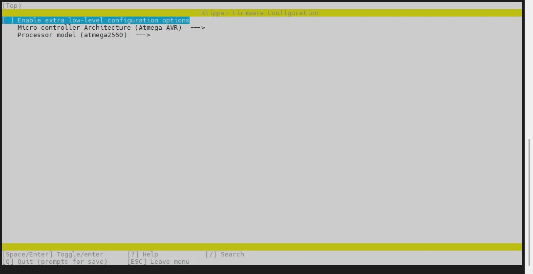 rm -rf ~/klipper/.config && rm -rf ~/klipper/outis to delete previous compilation data and firmware.make menuconfigis for compiling the firmware, after which the following interface should appear: