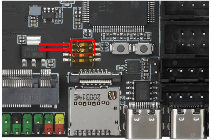 Après avoir positionné les interrupteurs DIP selon cette méthode, le port USB inférieur sera occupé par le dispositif inférieur, veuillez ne pas y connecter d'autres appareils