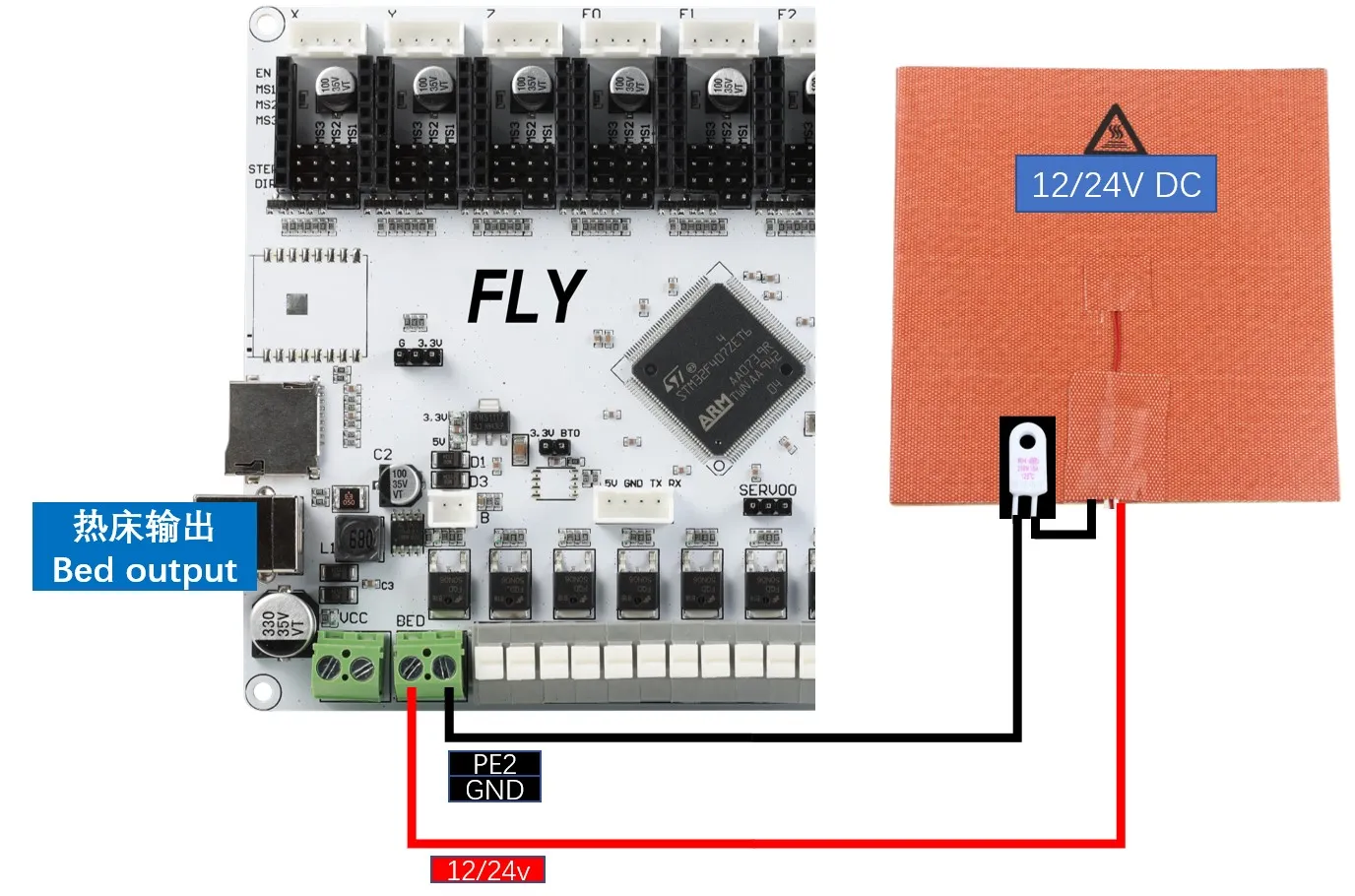 Il est déconseillé de connecter le Voron Tap à 24V, certaines versions utilisant 24V présentent un risque de brûlure du capteur Tap, ce qui n'est pas un problème des produits Fly, mais un défaut de conception du Voron Tap, veuillez en être informé !!!