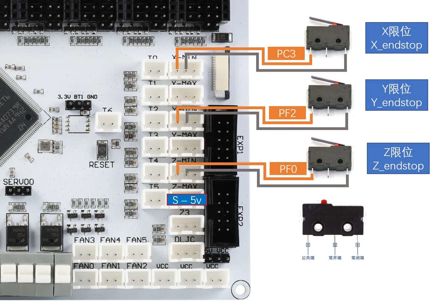 • Les fins de course peuvent être normalement ouverts (NO) ou normalement fermés (NC). En général, dans une imprimante 3D, il est recommandé d'utiliser NC, de sorte que si un problème survient dans le câblage du fin de course, le système signalera une erreur, ce qui peut éviter des collisions inutiles et protéger l'imprimante contre les dommages.