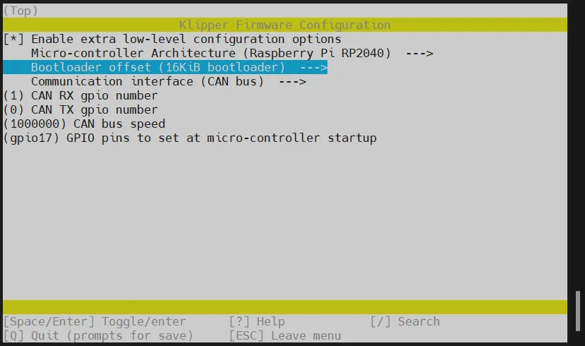 ESC,用于返回上一级菜单 Q键,用于退出Klipper固件配置页面Y键,在退出Klipper固件配置页面时,如果有提示,则点击Y键保存配置文件