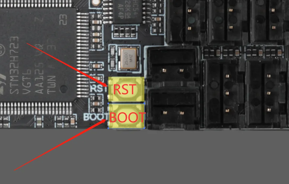 • Deuxième méthode : Après avoir connecté le câble de données à la carte mère et à votre appareil, maintenez le bouton BOOT enfoncé, appuyez sur le bouton RST, relâchez le bouton RST puis relâchez le bouton BOOT
