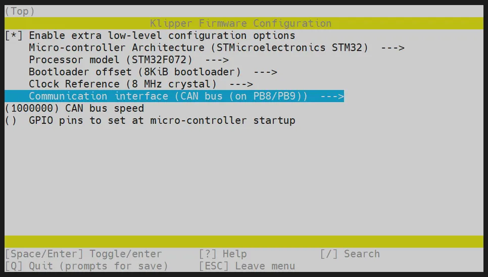 ESC,用于返回上一级菜单 Q键,用于退出Klipper固件配置页面Y键,在退出Klipper固件配置页面时,如果有提示,则点击Y键保存配置文件