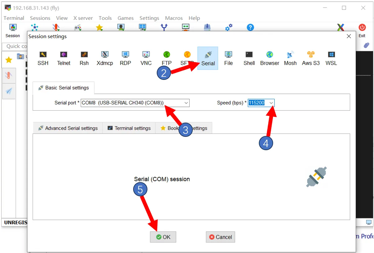 - MobaXtermを開き、以下の設定を行います。IPは前述の確認したものを入力するか、ルーターのバックエンドで確認してください。