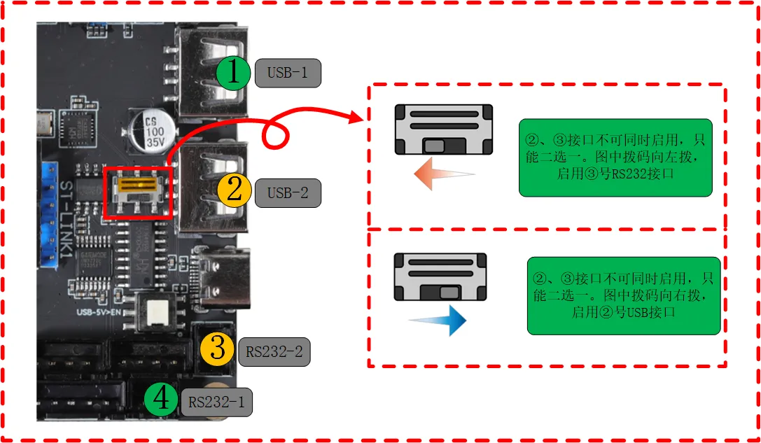 マザーボードクラスFLY-Dシリーズマザーボードフライ-D8-PRO(H723)オンセットディップスイッチの紹介このページの見出しオンセット周辺機器の紹介 ディップスイッチを右にすると、Type-Cポートの隣のUSBポートが開きます ディップスイッチを左にすると、Type-Cポートの隣のRS232ポートが開きます USBポートの紹介 カメラやメインボードなどの外部デバイスを接続できます