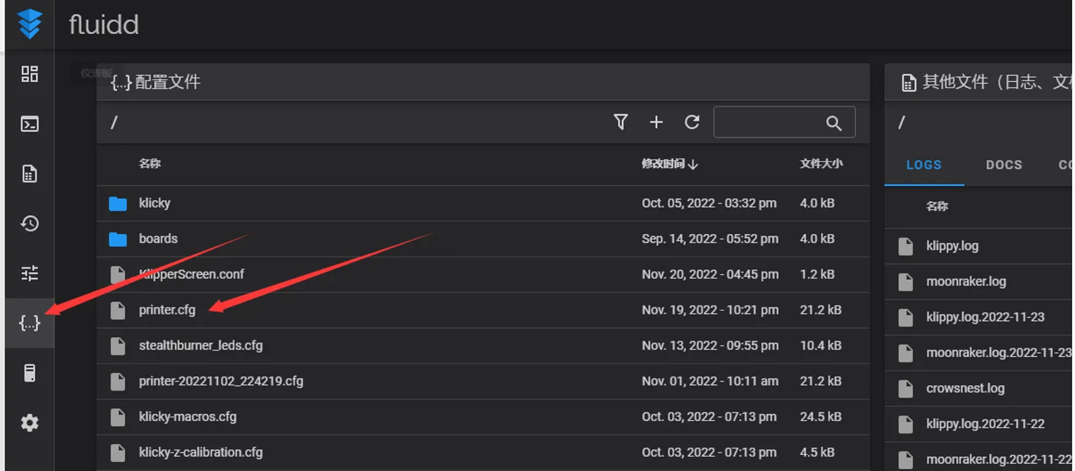 {…}、mainsailの場合はマシンを探し、クリックしてprinter.cfgを見つけます
