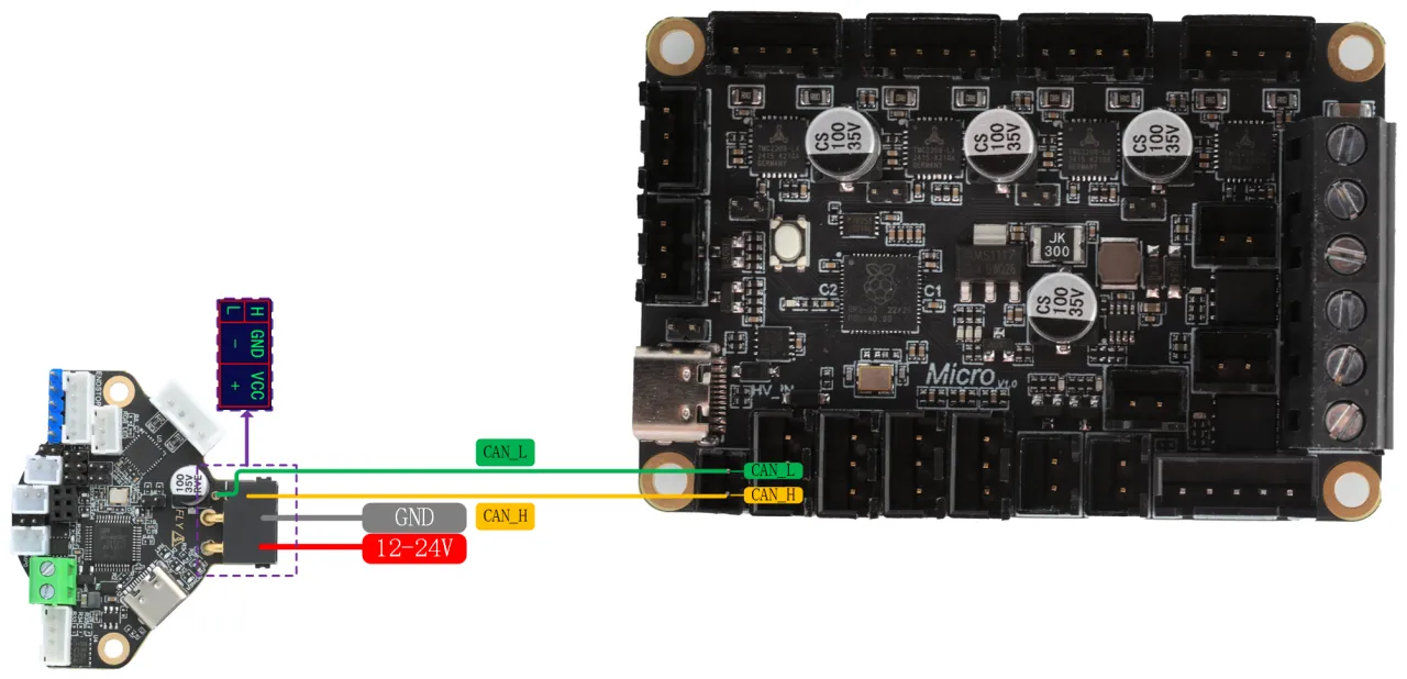 CANバスはリアルタイムアプリケーション用のシリアル通信プロトコルバスで、ツイストペアケーブルを使用して信号を伝送することができ、世界中で最も広く使用されているフィールドバスの一つです。CANプロトコルは、自動車内のさまざまな部品間の通信に使用され、高価でかさばる配線束を代替します。このプロトコルの堅牢性により、他の自動化や産業用途に広がっています。CANプロトコルの特徴には、完全なシリアルデータ通信、リアルタイムサポートの提供、最大1Mb/sの伝送速度、11ビットのアドレッシング、そしてエラーチェック能力が含まれます。 3Dプリンターでは、CANバスを使用してプリントヘッドとメインボード間の配線の数を減らします。元々は十数本の線が必要でしたが、CANを使用することで4本の線だけで済み、配線の数を大幅に減らし、配線作業の難易度を低減します。 本章では、CANブリッジの使用について簡単に概要を説明します。