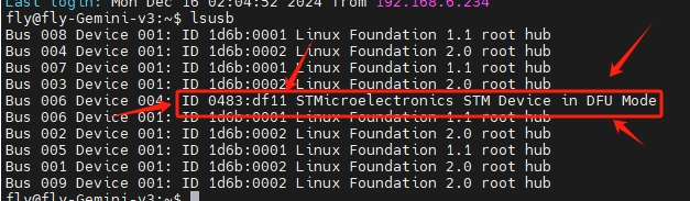 - 以下のコマンドを入力して基板がDFUモードに入ったか確認します