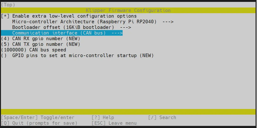 ESC,用于返回上一级菜单 Q键,用于退出Klipper固件配置页面Y键,在退出Klipper固件配置页面时,如果有提示,则点击Y键保存配置文件