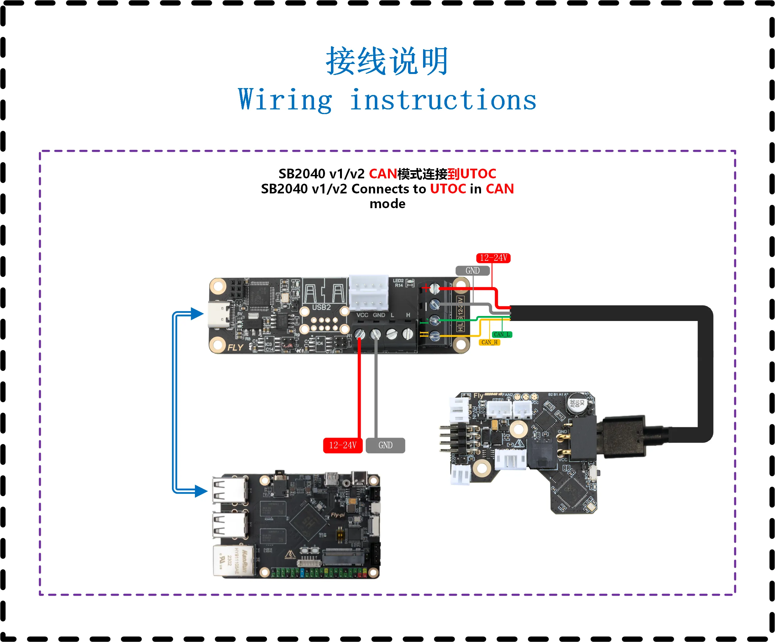 - ファームウェアを書き込む前に、XT30データケーブルを使用してツールボードをUTOCまたはブリッジファームウェアを書き込んだメインボードに接続します。以下は参考接続図です