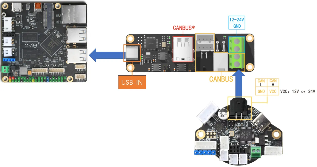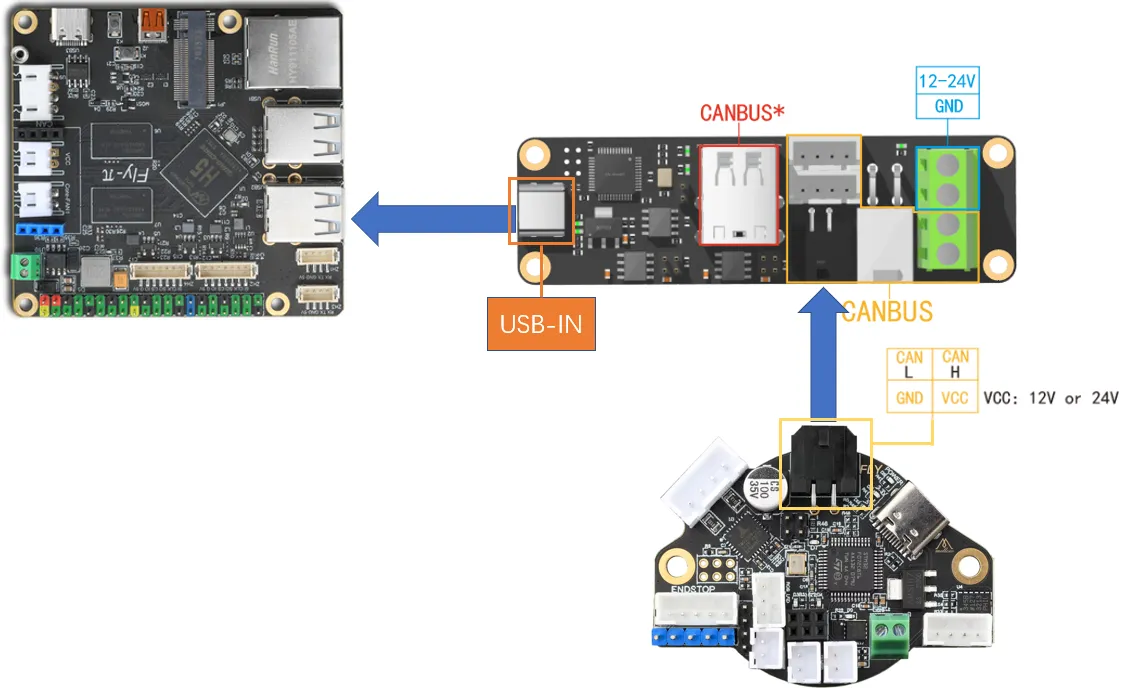 FLY UTOCはUSBをCANバスに変換するモジュールで、これによりFLY πのUSBポートをCANバスに専用化し、3DプリントマザーボードやSHT36/42などのCANバス製品を接続します。FLY UTOCにはさまざまな端子インターフェースが搭載されており、異なる使用シーンに柔軟に対応できます。また、UTOCは出荷時に既にファームウェアが書き込まれており、到着後即座に使用可能です。