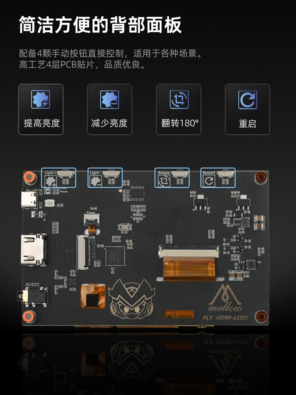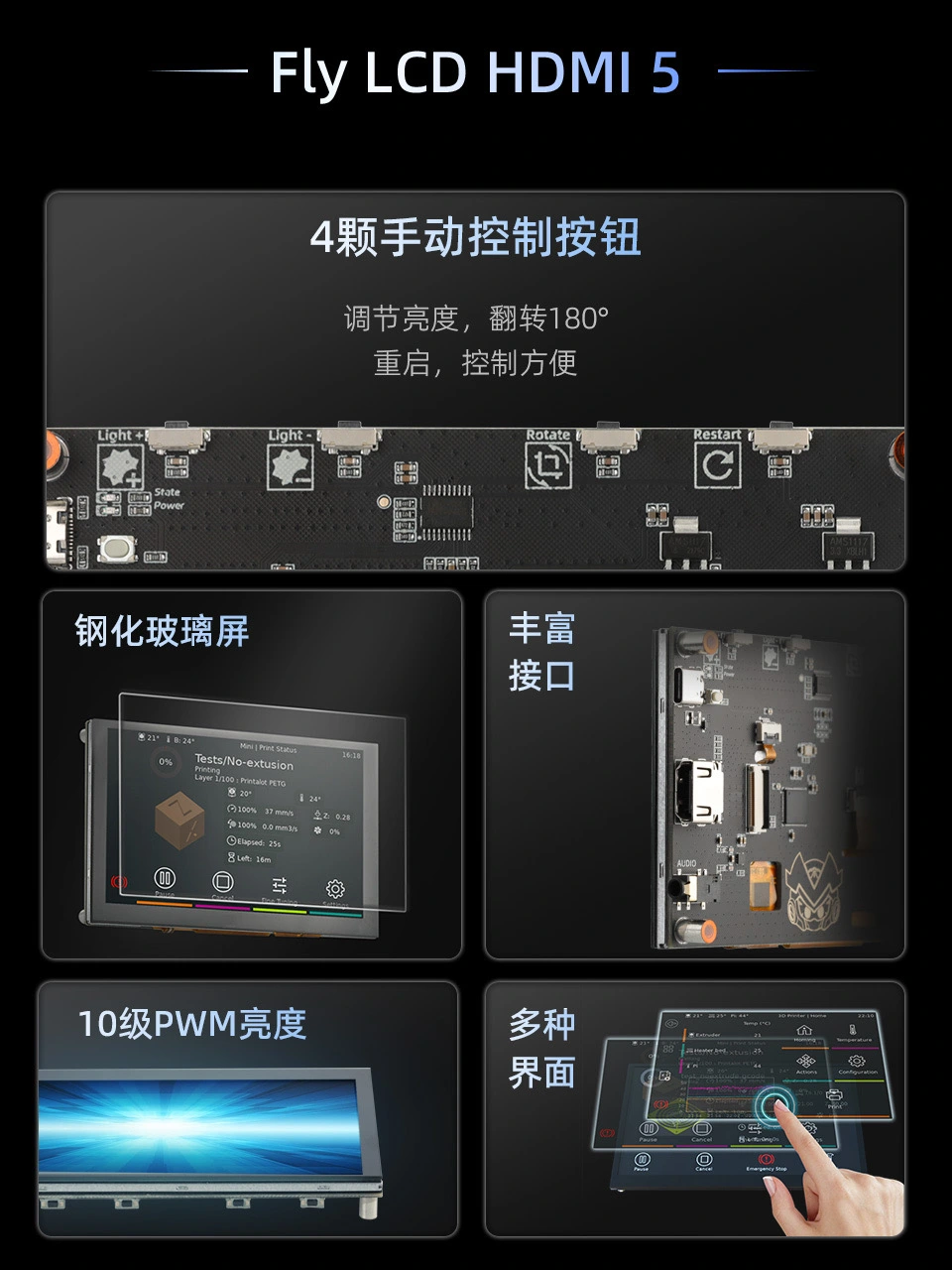 이 장치는 독특한 FPC(유연 인쇄 회로) 포트 디자인을 채택하여, Fly 디자인의 메인보드에 직접 연결할 수 있으며 HDMI 및 USB 케이블이 필요 없습니다. 이 간소화된 FPC 연결은 케이블 혼잡을 줄이고 깔끔하고 효율적인 인터페이스를 보장합니다. 그러나 이러한 진보적인 연결 방식을 채택했음에도 불구하고, 이 장치는 전통적인 연결 옵션을 선호하는 사용자를 위해 표준 HDMI 포트를 유지합니다. 유연한 연결성 외에도, 이 장치는 밝기 조절, 화면 회전 및 재부팅을 쉽게 조절할 수 있는 스마트 기능 키를 포함합니다. 고품질 수입 발포 접착제는 강력한 화면 접착력과 뛰어난 내구성을 보장합니다. 이중면 저저항 방열 기술은 터치 감도를 강화하여 사용자 경험을 더욱 원활하게 합니다. 황광 기술은 정확한 색상 재현을 제공하며, 표준 밝기는 500으로 과노출을 피합니다. 화면은 고강도 강화 유리로 보호되어 견고한 손상 방지 보호를 보장합니다. 이 장치는 Raspberry Pi와 같은 호스트 시스템과 완전히 호환되며, 히든 HDMI 포트 디자인을 채택하여 케이블을 장치 뒤쪽에 깔끔하게 숨겨 깔끔하고 전문적인 외관을 제공합니다. 고성능 회로 설계는 원활한 작동을 보장하여, 안정적이고 신뢰성 높은 3D 프린터의 이상적인 선택이 됩니다.
