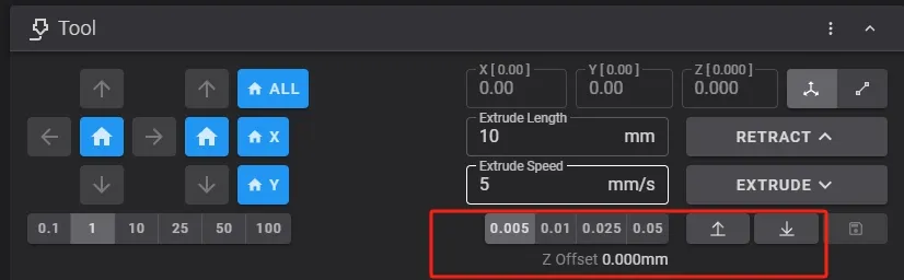 - 执行此操作后,UI 将显示 Z 轴调整框。请使用上述提到的手动 Z轴偏移校准(Paper Test)方法,将纸张夹在喷嘴和床面之间,然后确认该值。