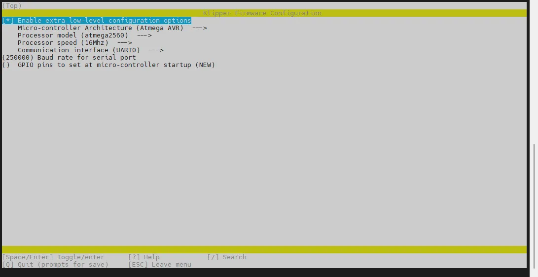 cd ~/klipper && rm -rf ~/klipper/.config && rm -rf ~/klipper/out && make menuconfig