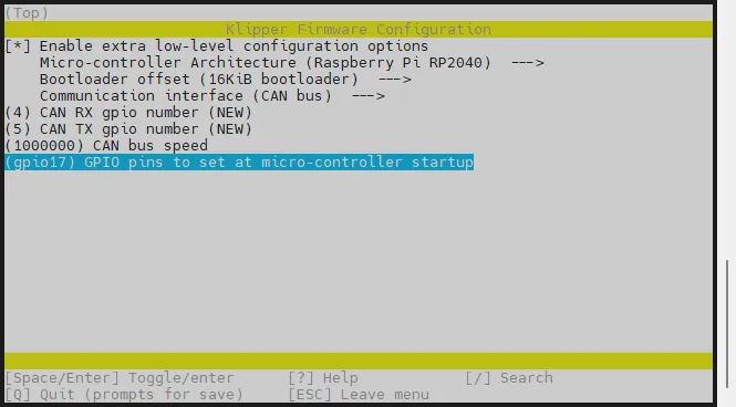 Выберите GPIO pins to set at micro-controller startup, введите: gpio17