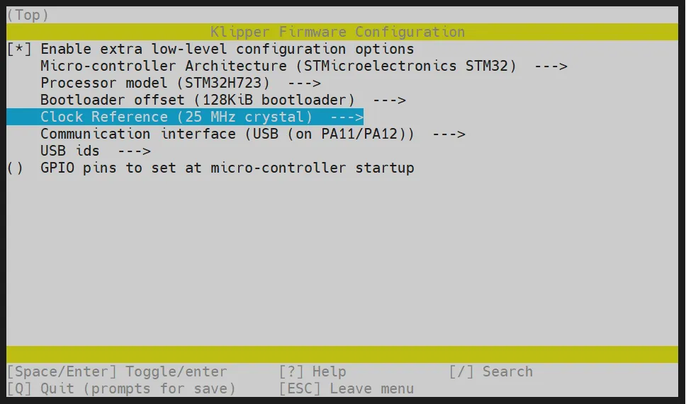 rm -rf ~/klipper/.config && rm -rf ~/klipper/outудаляет предыдущие данные компиляции и прошивку,make menuconfigкомпилирует прошивку. После выполнения должно появиться следующее окно: